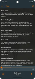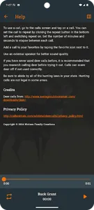 ** Ready for the 2024-2025 season. **Call Whitetail Deer simply and easily straight from your phone. Calls can even be played while "Do Not Disturb" is on. (Media sound has to be on in your "Do Not Disturb" settings.)Use an external speaker for the best sound quality.If you have never used deer calls before, it is recommended that you research calling deer before trying it out. Calls can scare deer off if not used correctly.Thanks for downloading!** Be sure to abide by all of the hunting laws in your state. Hunting calls are not legal in some areas. **Current Calls:Buck GruntBuck Tending GruntBuck Rage GruntBuck BawlBuck Social GruntBuck SparringBuck Aggressive RattlingBucks FightingBuck PawingBuck Rubbing TreeBuck SniffBuck WheezeDoe ContactDoe GruntDoe Breeding BellowDoe Estrus BleatDoe Estrus Bleat HeavyDoe Estrus Bleat MildFawn BleatFawn Bleat 2Fawn Distress