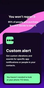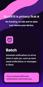 BuzzKill allows you to see the notifications you need to see when you need to see them and filter out everything else you don't. Here is just a taste of what BuzzKill can do:• Cooldown - Don't get buzzed multiple times when someone messages you multiple times in quick succession• Custom alert - Set a custom sound or vibration pattern for a specific contact or phrase• Dismiss - Automatically swipe away any notification you don't want to see, without hiding all notifications for that app• Reply - Automatically reply to a message if you haven't seen it after a while• Remind me - Keep reminding you until you see a notification• Undo - Gives you a second chance to tap on a notification when you accidentally swipe it away• Snooze - Receive your notifications in batches so they fit your schedule• Alarm - Get your attention such as for a security camera notification• Secret - Hide the content of the notification• And many more...FAQ: https://buzzkill.super.site/BuzzKill is privacy first. There are no ads, no trackers and no data ever leaves your device. Unlike pretty much every app on your phone and the Play Store it doesn't have access to the internet (you can check) so you can be sure that your data is safe.Looking for a free trial?BuzzKill cannot connect to the internet to verify purchases, so it does not offer a free trial in the app. However if you're not happy with your purchase, please press the contact support button in the app and I'll refund your order if you're outside of Google Play's returns period.Wear OSBuzzKill has a companion app for Wear OS that allows you to trigger certain actions on the watch based on the rules that the phone triggers. For example you can create a rule in BuzzKill to trigger an alarm when you receive a certain notification. With the BuzzKill companion app, you can have the alarm show up on your watch too.Accessibility Service APIBuzzKill includes an optional accessibility service that allows it automate certain actions on your device. For example you set BuzzKill to automatically tap a button in a notification. No data is collected and no data leaves the device. You do not need to enable the accessibility service unless you create a rule that uses it.Does BuzzKill work with phone calls?Unfortunately phone calls work very differently to notifications and they have limited support in BuzzKill. E.g. you can't set a custom vibration or sound for a phone call, but you can use the unsilence rule to temporarily allow a phone call to unsilence your rule based on the time/location/phone number that is calling.